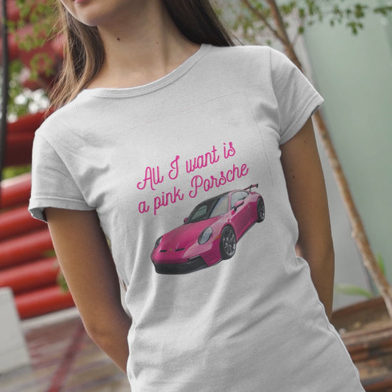 Turn your dream car into a style statement. This “All I Want Is a Pink Porsche” tee features a vibrant pink Porsche GT3 printed on a soft Heather White base – perfect for those who love bold color, clean design, and girl-power energy.