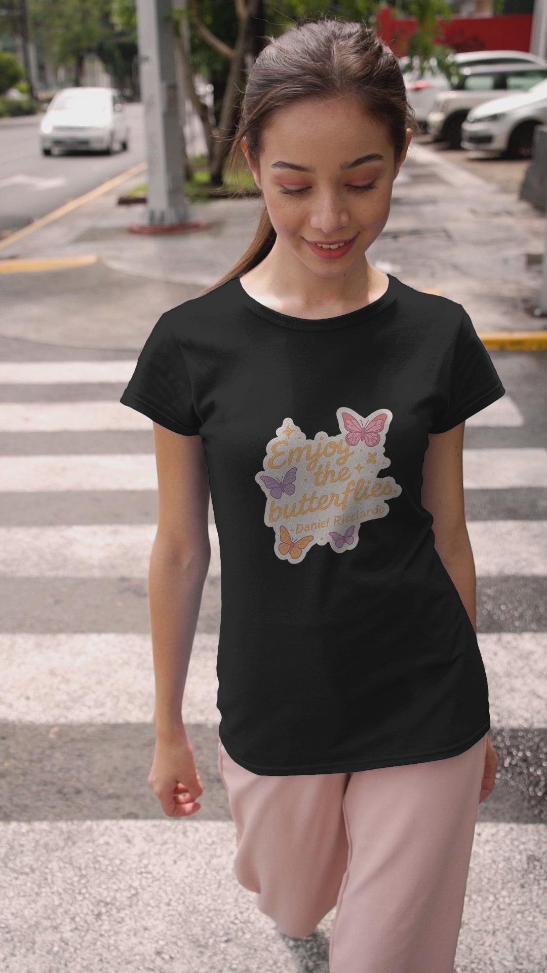 Let your inner Ricciardo shine with our "Enjoy the Butterflies" oversized T-shirt – a tribute to the iconic F1 driver Daniel Ricciardo and his joyful approach to racing and life. With soft pastel butterflies and a bold quote, this shirt is made for both racing fans and dreamers. Perfect for casual days, race weekends, or just spreading good vibes.
