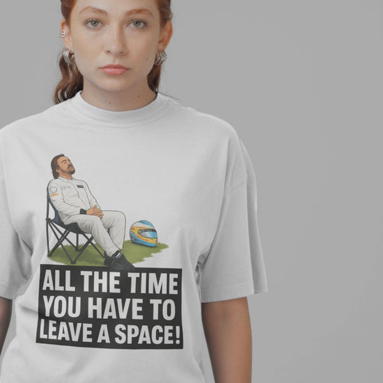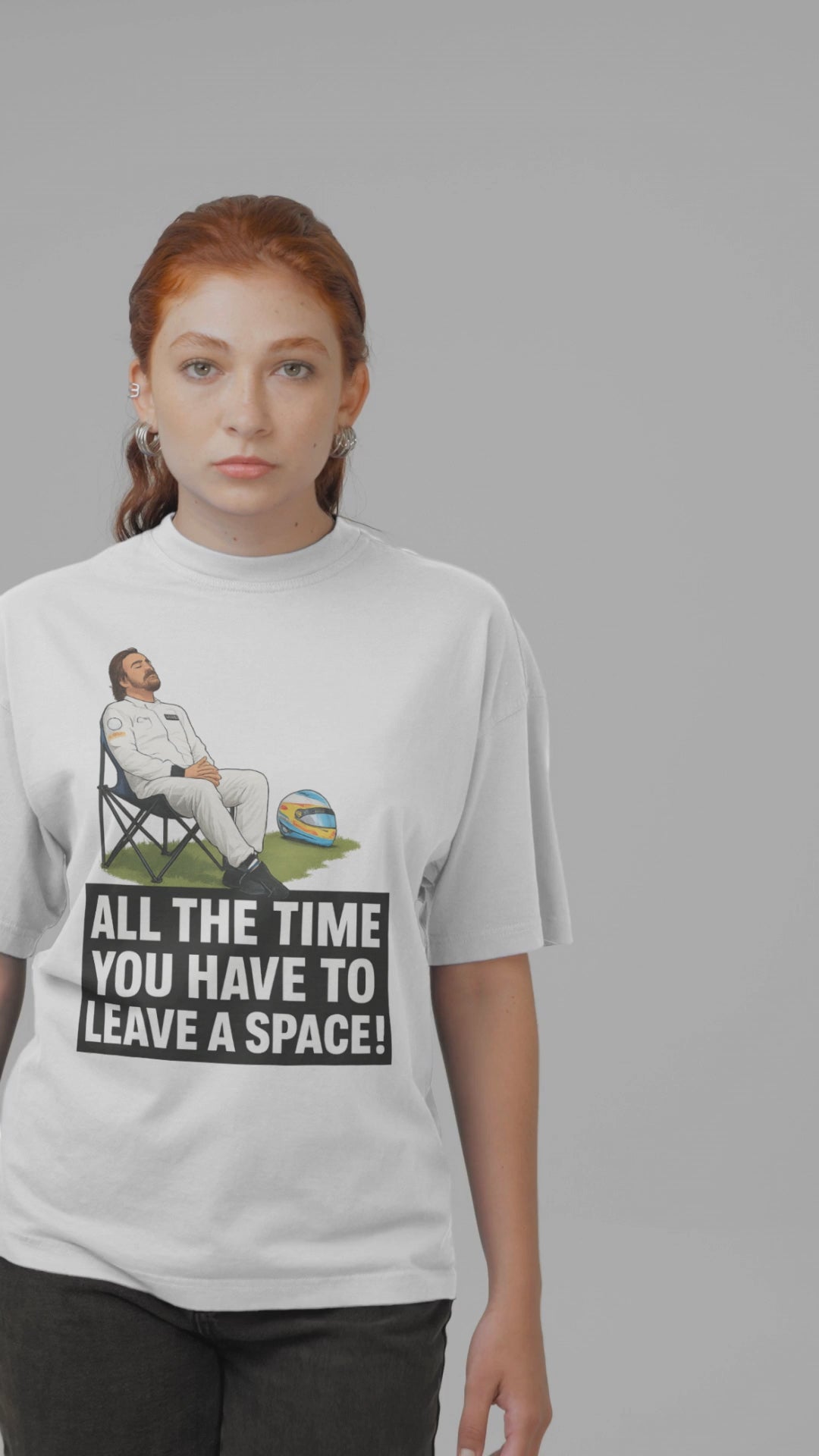 Own a piece of Formula 1 history with the Fernando Alonso – Leave a Space Tee. Featuring the iconic radio message “All the time you have to leave a space!” paired with Alonso’s famous folding chair meme, this shirt is a must-have for true F1 fans.