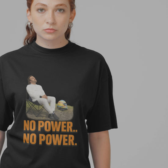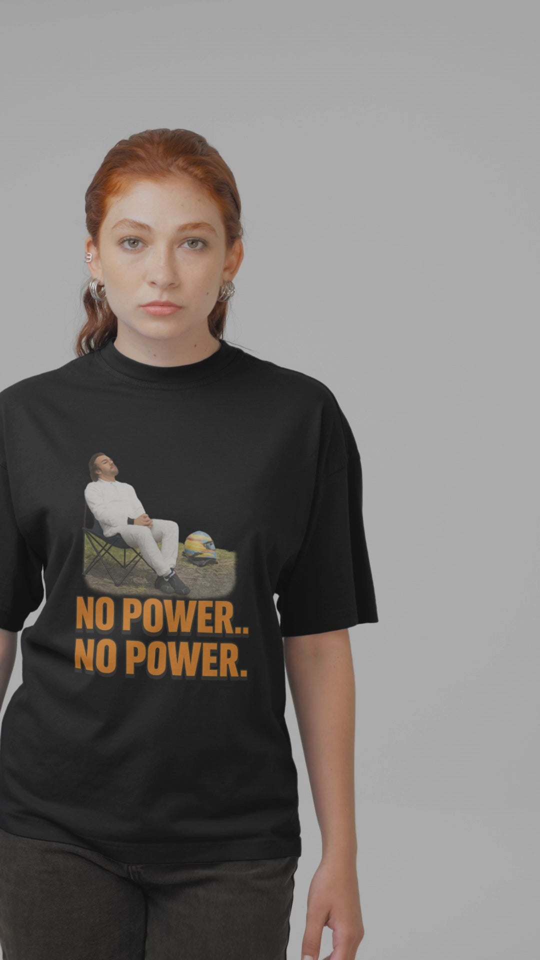 Celebrate one of the most legendary F1 memes with the Fernando Alonso – No Power Meme Tee. This design captures the unforgettable moment of Alonso relaxing on a folding chair trackside, paired with his iconic radio quote “No Power, No Power”.