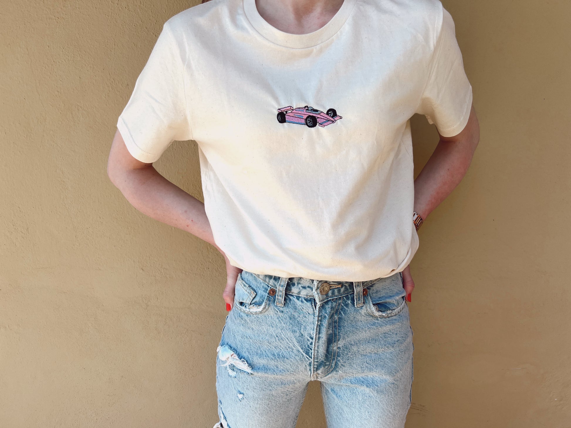 Step into motorsport history with our Vintage Formula Embroidered T-Shirt. This unique piece features a detailed embroidery of a retro race car, carefully crafted for fans of classic racing style.